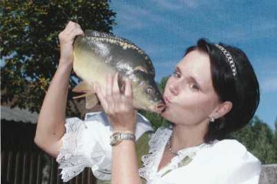 Ich - Sabine Plätzer - wurde 1974 in Höchstadt an der Aisch geboren, bin zwischen Karpfenweihern im Ortsteil Lappach aufgewachsen und habe meinen Lebensmittelpunkt auch noch heute in Höchstadt an der Aisch. Mich begeisterten schon als Kind die Aischgründer Spiegelkarpfen,ob beim Abfischen oder bei den geselligen Karpfenpartien. Meine Familie ist über Generationen selbst im Besitz von Karpfenteichen und sie pflegen die Aufzucht und Verwertung unseres Naturproduktes noch bis heute. Die Ideengeberin Frau Marga Oettinger (+), 1. Vorsitzende der Höchstadter Fosanächter, wählte mich zur 1. Aischgründer Karpfenkönigin auf Lebenszeit aus und bereitete mich auf die Inthronisierung, die am 05.05.2001 stattfand, vor. Anlass war die Setzung des Steinkarpfens „Fridolin“ – unser Wahrzeichen des Aischgrundes mit Standort in „Frankens lebendiger Mitte“ – Höchstadt a. d. Aisch.