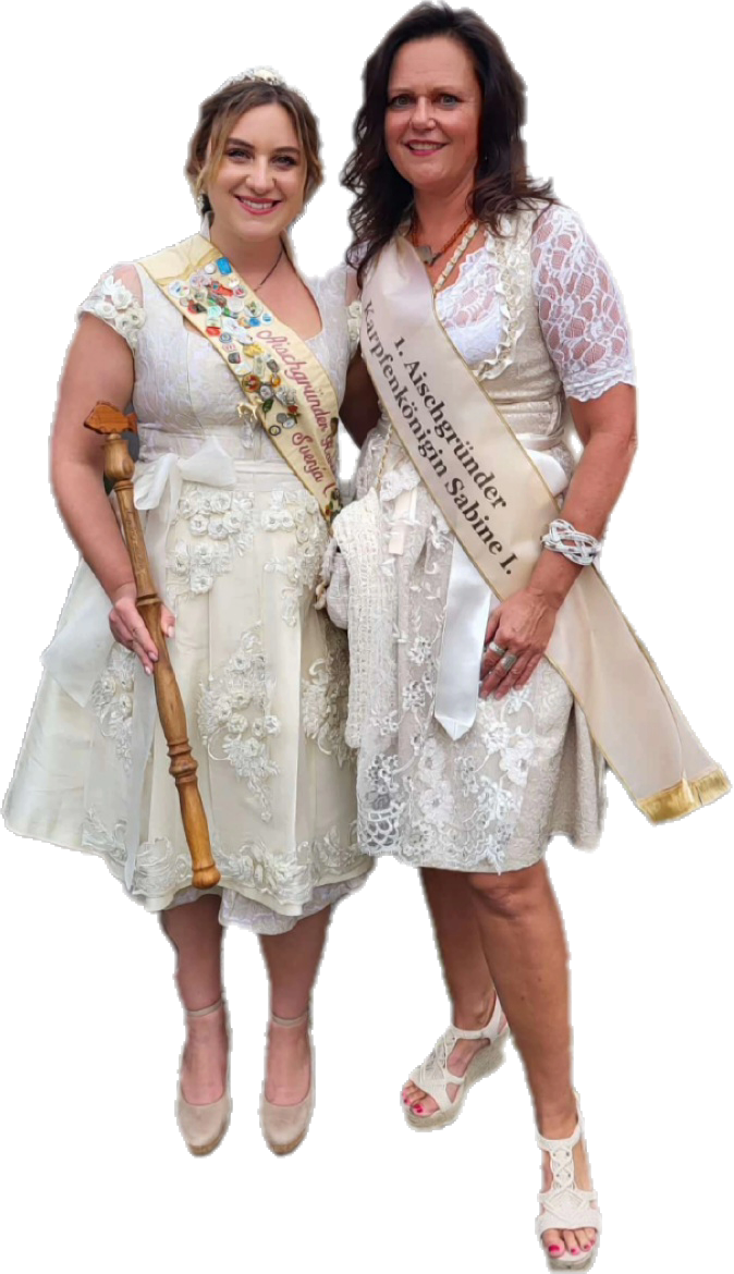 und noch viele schöne Einsätze… Zur Ausübung des Ehrenamtes scheute ich auch nicht den erheblichen zeitlichen und finanziellen (über 95 %) Aufwand meinerseits, den ich als Karpfenkönigin zum Wohle vom Aischgründer Spiegelkarpfen und der Region für den Aufbau des Königinnenamtes erbracht habe. Es macht mich sehr stolz, dass ich ein wunderbares Königinnen-/Ehrenamt über 8 Jahre für den Karpfen und meiner Heimat Höchstadt an der Aisch leben durfte und ich den Grundstein für die Nachfolgerinnen legte. Ich freute mich auch sehr über die Amtszeit von Svenja I, da sie schon als kleines Mädchen davon träumte auch einmal Karpfenkönigin zu sein und sie meine Amtszeit schon miterleben konnte. Auch ihr wurde die Liebe zum Karpfen in die Wiege gelegt. Herzlichen Dank, dass ich als „Queen Mum“ am 01. September 2025 bei der Abdankung dabei sein durfte.